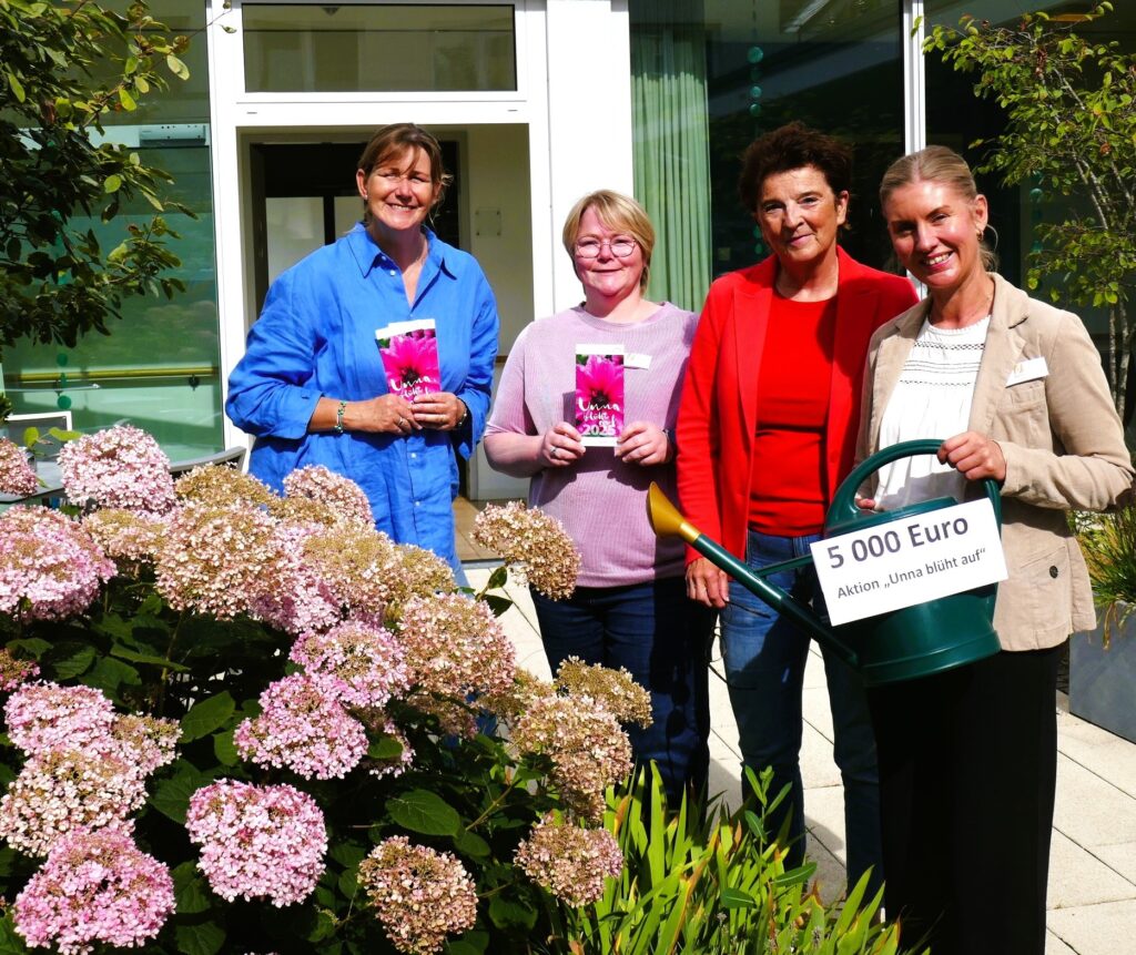 Ein im wahrsten Sinne „wunderschönes“ Ereignis unterstütz unser Heilig-Geist-Hospiz Unna: 5000 Euro – gesammelte Spenden aus den Gärten bei „Unna blüht auf“ und noch ein wenig mehr von der Bürgerstiftung – haben jetzt die Vorstandsmitglieder der Stiftung Dörte Knauf (l.) und Simone Melenk (2.v. r.) übergeben. Symbolisch versteht sich, das Geld fließt natürlich aufs Konto. Aber immerhin eine neue Gießkanne für den Hospizgarten als Mitbringsel hatte das Stiftungs-Duo dabei.