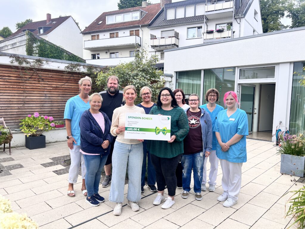 Beim Sommerfest des Seniorenhauses Neue Caroline in Holzwickede fand eine Spendenaktion zugunsten unseres Hospizes statt. Mitarbeitende des Sozialdienstes und der Betreuungsassistenz verkauften Eis und sammelten so stolze 680 Euro für den guten Zweck. Die Initiatoren aus Holzwickede kamen nun zur Spendenübergabe persönlich zu Besuch und überreichten den Scheck an Hospizleiterin Mareike Sorgatz und ihr Team.